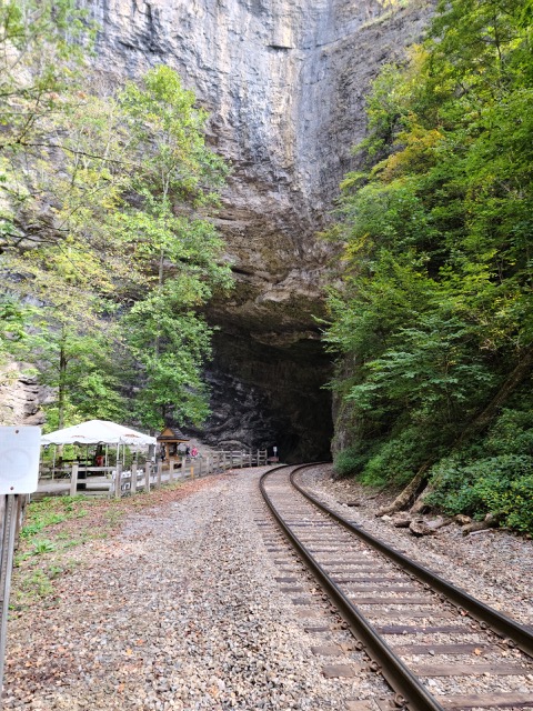 The natural tunnel was the star of the show of course. This park is a geologist’s dream, or anyone who is interested in rocks, fossils, and the history of the formation and changes of our beloved Earth. In the above picture you can see the immense mass of a rock wall, as high up as 450 feet. Most of this is limestone, a type of rock that is eroded by water much quicker than other types of rock. Scientist believe that a million years ago, perhaps even longer, very acidic groundwater slowly but surely seeped through the limestone crevices. High above in the rock you can see a fault line, creating even more fragility in the rock, and giving less resistance to the rain water. Over time, slowly but surely, the rock collapsed, a huge sinkhole that fell to the ground, creating a tunnel and a creek. Railroad tracks were built by the South Atlantic and Ohio railroad in 1893. It originally was a passenger train, but for years now has only been used to haul coal between the two states, Kentucky and Virginia.